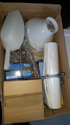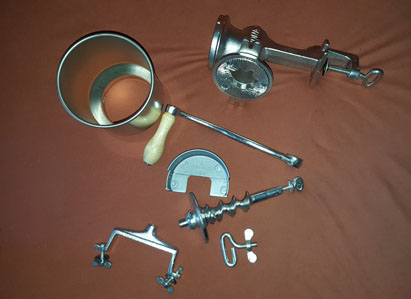 Darunter liegen die Bügelflaschenverschlüsse, die Abfüllpistole und noch komplett verpackt und in Einzelteile zerlegt die Malzmühle.
