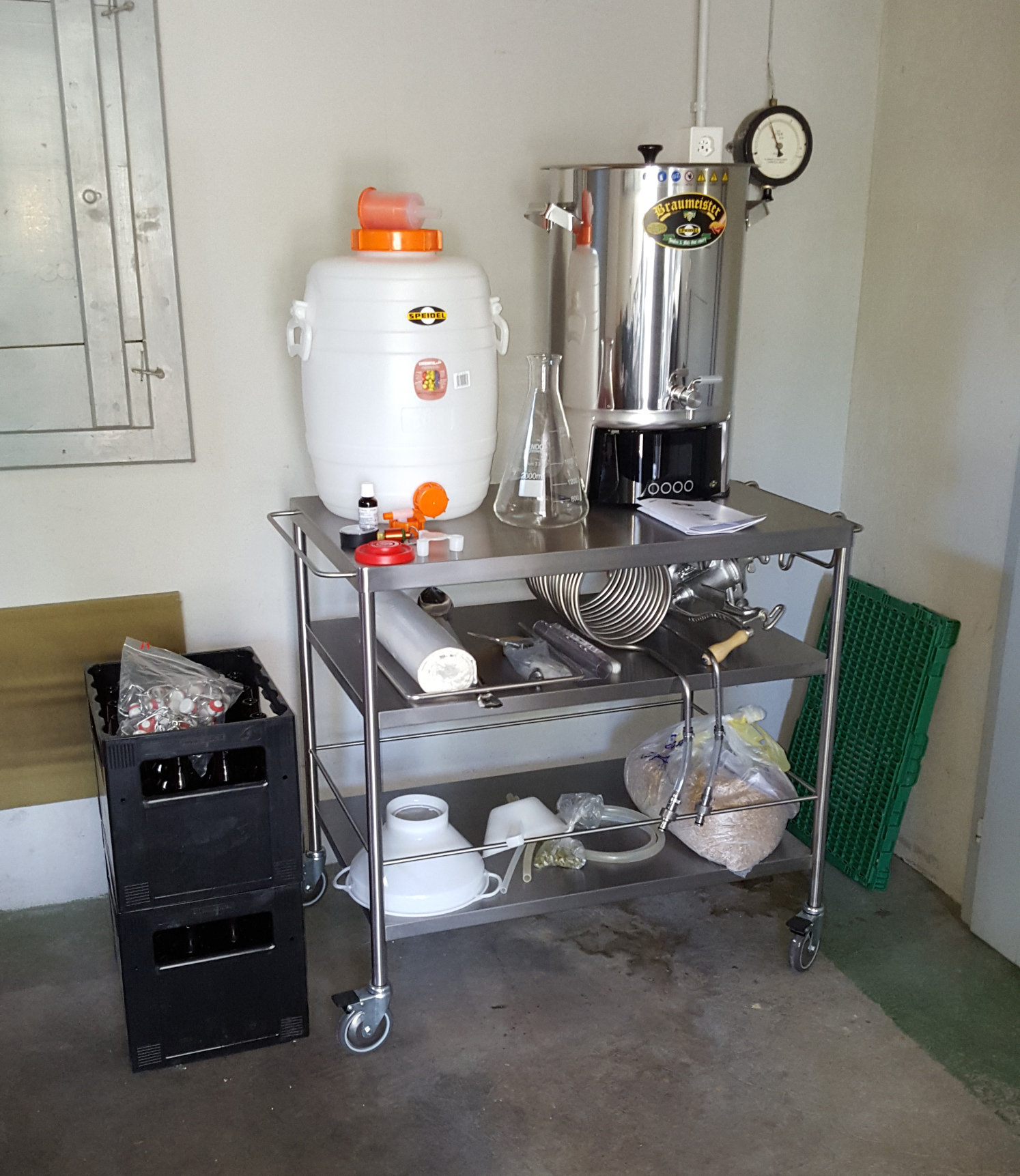 Auf einer Palette findet alles Platz, was später für die Bierherstellung benötigt wird. Vom Gärfass (oben), über den Braumeister (rechts) bis zu den Bügelflaschen (links unten). Das etwas kleinere Material/Zubehör steckt in der Kiste links unter dem Gärfass.