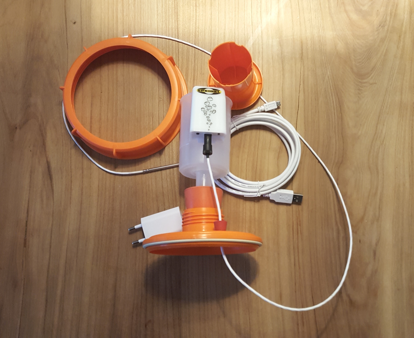 Im Lieferumfang sind das Modul mit Klett-Klebestreifen, ein runder Klebemagnet, ein Gummistopfen, ein lebensmittelechtes Sensorkabel zur Temperaturmessung sowie ein USB-Stromversorgungskabel enthalten. Ohne Steckdose läuft somit nichts. Nicht mit dabei aber Voraussetzung ist ein Gärspund inkl. Stopfen auf einem Gärtank. Das Modul wird mittels Klett-Klebestreifen bündig an die obere Kante des Gärspunds geklebt, zudem wird oben auf dem Gärspunddeckel mittig ein Klebemagnet angebracht. Nun muss noch ein Loch in den Deckel des Gärfasses gebohrt werden, damit das Sensorkabel für die Temperaturmessung in die Bierwürze im Fass eingetaucht werden kann.