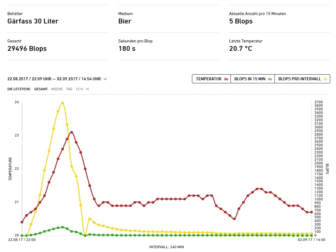 Damit Daten übertragen werden können, muss das Modul ins heimische WLAN eingebunden werden. Das kann mit jedem WLAN-fähigen Gerät eingerichtet werden, indem man dieses per WLAN mit dem Modul verbindet und anschliessend die Verbindungsdaten des Routers hinterlegt. Tönt etwas kompliziert, hat aber mit dem Handy problemlos und einfach funktioniert. Um nun die Gäraktivitäten verfolgen zu können, ist zwingend ein MySpeidel-Account nötig, damit das Gerät die Blobs pro Zeiteinheit sowie den Temperaturverlauf an ein Ziel senden kann.